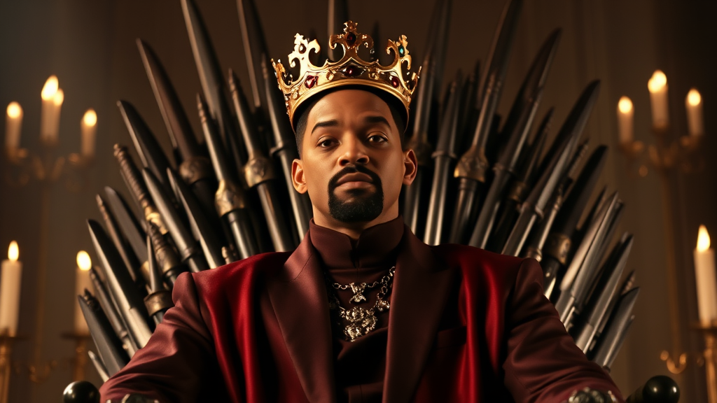 Will Smith, donning a tilted crown, is seated regally on a throne forged from swords, reminiscent of both the grandeur of Game of Thrones and the charisma of the Fresh Prince of Bel-Air. The scene is bathed in dramatic cinematic lighting, capturing the unique fusion of medieval majesty and '90s urban flair, blending the worlds of Westeros with the vibrant energy of Bel-Air in a captivating TV still.