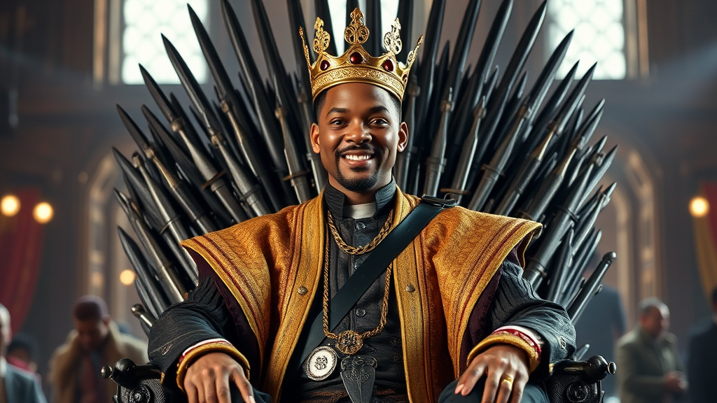 Will Smith, dressed in a luxurious medieval outfit with a tilted crown, confidently sits on the iconic Iron Throne made of swords. The scene combines the dramatic atmosphere of Game of Thrones with the playful essence of Fresh Prince of Bel-Air. Cinematic lighting casts dynamic shadows, highlighting the blend of charismatic humor and regal authority. The backdrop features elements from both the vibrant cityscapes of Bel-Air and the imposing architecture of King's Landing, creating a unique crossover universe where humor meets epic fantasy.