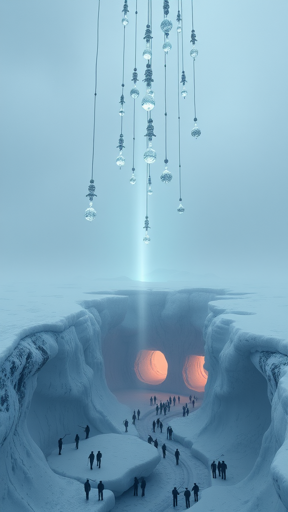 Wind chimes from the past suspended in the gray, motionless sky, a soft luminescence emerging from my ears, a hum of glacier rivers advancing towards me. An intricate network of tunnels beneath Antarctica's thin ice, teeming with figures in motion, captivating and grand, fantasy digital artwork, octane render.