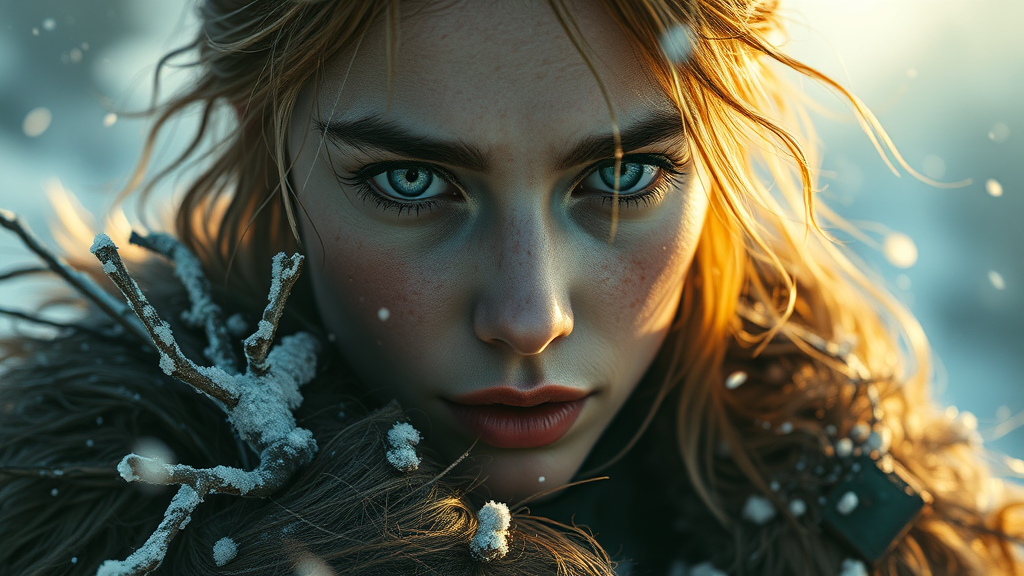 Winds of winter au naturel cinematic scene featuring a character with captivating grey eyes, rendered in hyper-detailed digital art. The art invokes style influences from Klimt, Nixeu, Ian Sprigger, WLOP, and Krenz Cushart, showcasing cinematic lighting and studio quality with smooth renderings accomplished using Unreal Engine 5 and Octane Render. The artwork is exquisite, emphasizing realistic anatomy and proportions, steering clear of any distortions like extra limbs or malformed features. The character's natural essence is highlighted through a harmonious blend of nature and intricate detail, creating a compelling visual narrative that is both immersive and artistically refined.