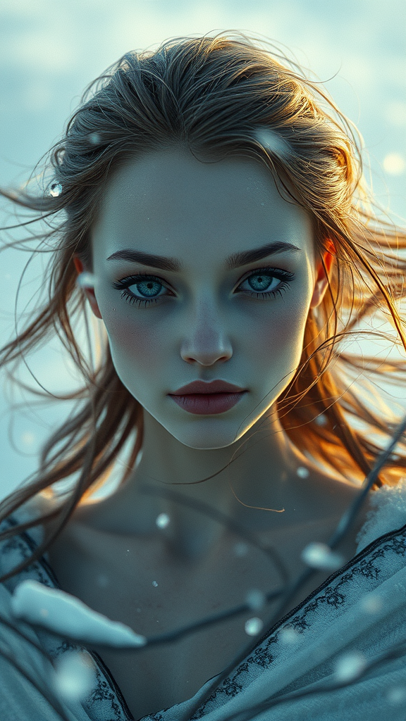 Winds of winter envelop a natural landscape, featuring a figure with striking grey eyes. The scene is rendered in hyper-detail, with digital art techniques that emphasize cinematic lighting and studio quality. The smooth render is reminiscent of Unreal Engine 5 and Octane, merging artistic influences from Klimt, Nixeu, Ian Sprigger, WLOP, and Krenz Cushart. Though the art style is intricate and trending on ArtStation, subtle imperfections—like slight jpeg artifacts or minor blurring—add a unique character. The figure's anatomy is surreal yet captivating, bringing forth an otherworldly beauty amidst a windswept, icy realm.