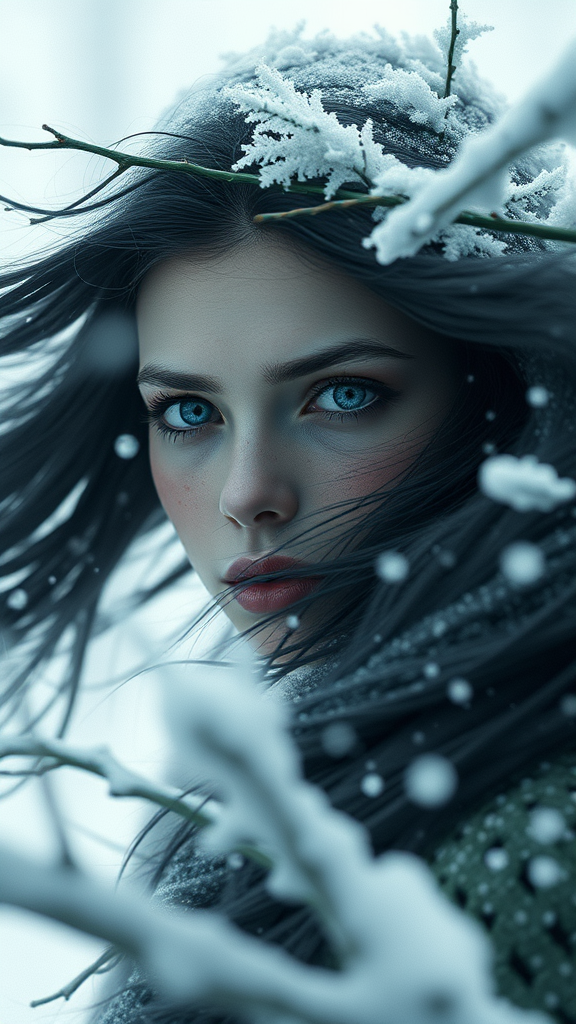 Winds of winter surround a figure with grey eyes, captured in hyper-detailed digital art. The scene is inspired by an art style reminiscent of Klimt, Nixeu, Ian Sprigger, WLOP, and Krenz Cushart, featuring cinematic lighting and studio quality reminiscent of artstation's trending art. The composition showcases a smooth render utilizing Unreal Engine 5 and Octane's rendering capabilities. The artwork embodies an au naturel aesthetic, focusing on raw, natural elements. Despite maintaining an impeccable level of detail, the image contains intentional imperfections—muted and soft edges, suggesting motion or a dream-like quality. Elements appear slightly out of frame, hinting at mystery beyond the borders. The grey-eyed figure, central to the piece, is rendered with careful attention to avoid any unnatural mutations or exaggerated features, highlighting elegant anatomy and balanced proportions.