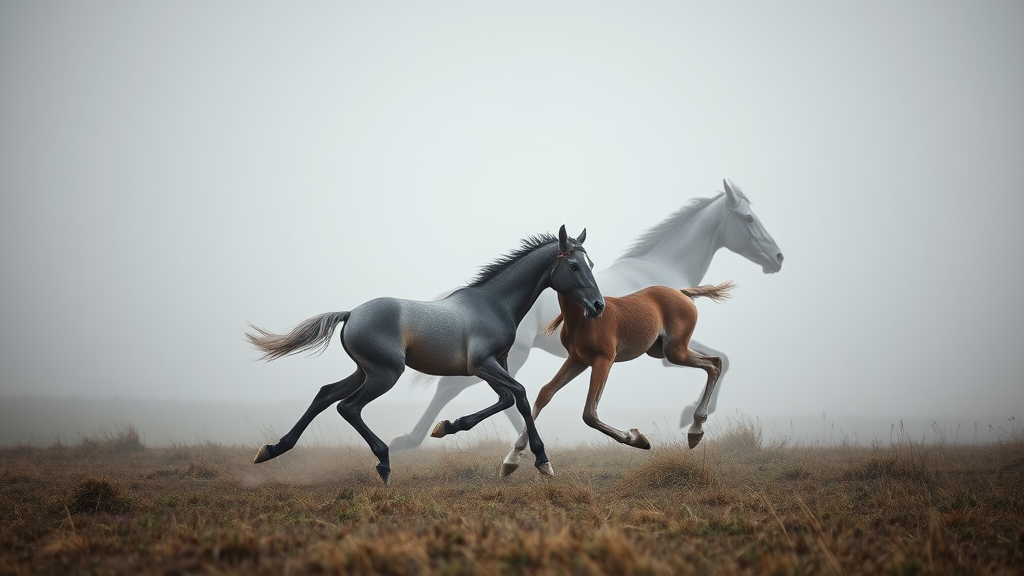 windy moor with no fours. a thick fog bank. athletic pose portrait image. iconic side profile running gray mare and foal in low-visibility haze. incredibly detailed nostalgic shot. photograph --q 1.5 --v 6.5 --ar 3:4.
