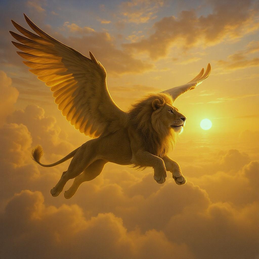 A majestic winged lion soars gracefully across the sky, its powerful wings cutting through golden-hued clouds that shimmer in the warm, cinematic lighting. Captured with a DSLR camera, the scene evokes a sense of awe and wonder, as the setting sun casts a radiant glow across the lion's gleaming mane and outstretched wings, highlighting its regal and mythical presence against the vibrant sky.