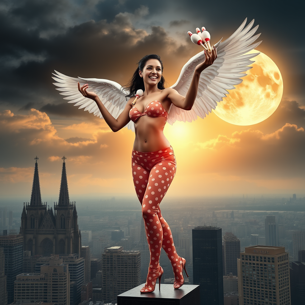 Winged woman, a vibrant flamenco dancer, stands atop a skyscraper in a densely populated metropolis, backgrounded by the majestic silhouette of a Gothic cathedral, bathed in the soft, golden light of a full moon partially shrouded in wispy clouds. Her taut physique is clad in skin-tight legwear adorned with an array of polka dots in matching pastel hues to the warm, inviting smile that defines her. The smile is unmatched in beauty, unseen on a face that combines innocence with slyness. She holds pins that look like they're flaming in the air as she balances them with the tirelessness of a master juggler, complete with tosses and catches of tossed balls in mid-air with unrivaled skill. Amidst this playfulness, the sky behind her frowns, ominous with foreboding and signs of a storm, yet illuminated by rays of soft moonlight, total in its beauty and simultaneously futuristic and heavyweight, reflecting in part the body curve that doubles as both physics and mysticism.