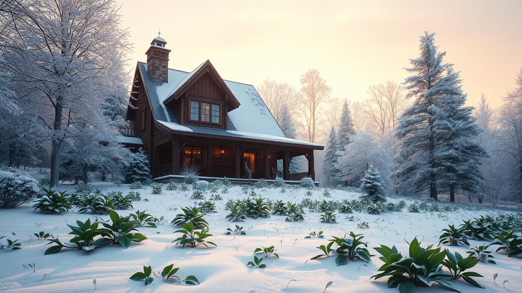 Winter Whispers: A Serene Abode Enveloped in Frosty Delight A majestic 8K CG Unity landscape unfolds, showcasing a lavish, photorealistic winter wonderland, complete with intricate details and textures that immerse the viewer in a world of tranquility. The scene revolves around a stately, in-harmony-with-nature house, its wooden facade exuding warmth, nestled among a tapestry of vibrant, emerald-green leaves scattered across the snow-kissed ground, like a tender blanket. The atmosphere is alive with the soft, golden-hour light, painted across the wintry canvas in a gentle hue, casting long shadows that delicately dance across the landscape. The bokeh effect, a delicate sprinkle of out-of-focus light, whispers a sense of magic, framing each element of the scene with a soft, ethereal glow. HDR comes into play, imbuing the image with an exceptional level of depth and visual detail, the contrasts between light and dark precision-crafted to capture the essence of the scene. This is further enhanced by the dynamic bloom effect, which delicately overflows from the sun's position, casting a warm, glimmering aura across the landscape. At the heart of the scene, the house stands as a testament to exquisite, photorealistic detailing. Every portion, from the delicate frost that clings to its wooden edges to the maturing vines that stretch across its facade, speaks to the level of dedication and artistic precision that has gone into its creation. The leaves on the ground, intricately textured and varied, add a sense of depth and immersion, drawing the viewer's eye around the landscape. The bokeh effect, ubiquitous yet mercurial, further blurs the focus at strategic points, creating an engaging visual dynamic. However, this is balanced perfectly by the precise depth of field, which insists on drawing the viewer's eye back to the house, often the central focus of the shot. Every element, from the adverse strokes of the bare trees to the intoxicating splash of color from the winter flowers, is seamlessly woven into the landscape, creating a profoundly dynamic and delt-like image that freezes time with every static frame.