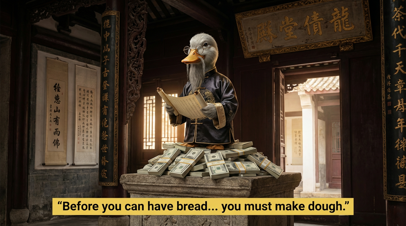 A photorealistic image of an anthropomorphic duck, styled as an old, wise Chinese scholar, standing in a traditional Chinese temple. The duck wears round spectacles and a long, flowing grey beard, dressed in an ornate silk kimono with black trim. It stands on a stack of US dollar bills, which are placed on an ancient stone pedestal. The background features dark wood pillars with intricate carvings, traditional Chinese scrolls with calligraphy, and a large gold-lettered sign at the top. The lighting is soft and warm, creating a serene and contemplative mood. The colors are rich, with deep browns of the wood, gold accents, and the muted tones of the duck and its attire. A yellow caption at the bottom reads: "Before you can have bread... you must make dough."