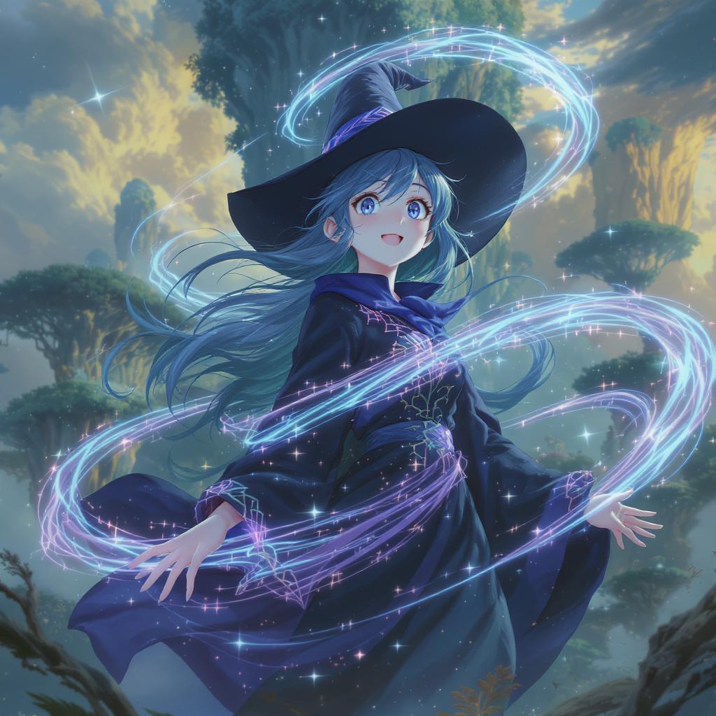 A teenage witch stands in awe as vibrant, swirling magic encircles her entire body. With cinematic lighting highlighting the intricate details, the scene captures an ultra-sharp focus in 8k quality. The magical aura around her glows with sparkles, creating a mesmerizing spectacle reminiscent of artwork from Granblue Fantasy and Artgerm, set against an amazing background inspired by Studio Ghibli. Every detail is vibrant and dynamic, from the shine of the magic to the expression of wonder on her face, resulting in a breathtaking piece without visual distractions like errors, artifacts, or anatomical inaccuracies.