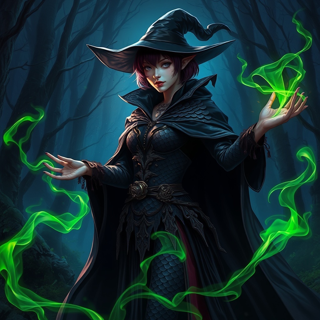 A dark witch stands poised in an adventurer's costume, her big cloak billowing around her in a fantasy forest landscape. Her attire is adorned with dragon scales, reflecting the mystical aura of the scene. She wields fantasy magic, her short purple-black faded hair trimmed stylishly. The dark night is illuminated by an intricate play of light, highlighting her elegant features with clear focus. This detailed illustration captures the essence in a digital painting style, enriched with green neon smoke swirling around her. Inspired by the works of masters like VLOP, Artgerm, Greg Rutkowski, and Alphonse Mucha, this concept art is a matte painting of a masterpiece, where the enigmatic allure of the witch blends seamlessly with the forest's enchanting ambiance.