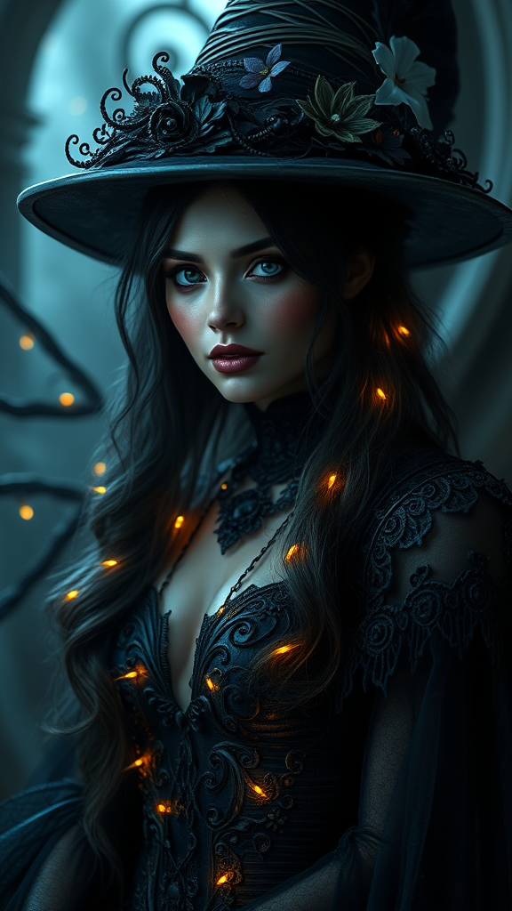 Witchy enchantress immersed in a shadowy realm, her dark and intricate attire gleaming with fairy lights; a hyper-realistic character design showcasing exquisite detail and mastery. The volumetric lighting casts an ethereal glow, enhancing the ultra-realistic textures and highlighting her enigmatic presence in high dynamic range, creating an awe-inspiring masterpiece in a 9:16 aspect ratio.
