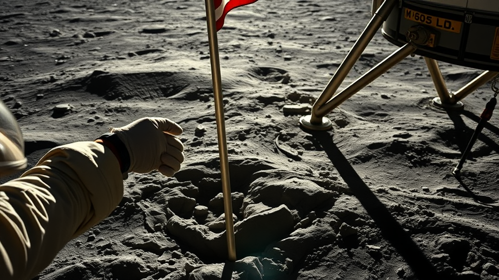 With the expanse of the lunar surface stretching out beneath me, I peer through my helmet visor, the sun's glare softly reflecting off its curved surface. My gloved hands grip the American flag pole, steadying it as I plant it firmly into the powdery lunar dust, where fresh boot prints mark my presence. As the pole goes halfway into the surface, the flag begins to unfurl in the vacuum, motionless yet proud against the backdrop of space. To my right, the leg of the lunar module casts a crisp shadow, a silent witness to this moment. The vivid details captured by the Hasselblad camera in my hand highlight the historical significance of the scene, reflecting a journey that started on Earth and culminated here, where time feels both fleeting and eternal.