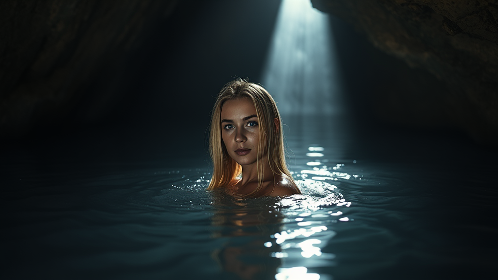 Within the hushed confines of a dimly lit cavern, a natural hot spring steams gently, its warmth beckoning through the cool, shadowed air. A woman with long, flowing blonde hair, damp and glistening, moves gracefully through the water, her gaze meeting the onlooker's with quiet intensity. A sliver of sunlight pierces through the cave's mouth, dancing upon the water’s surface to cast shimmering silhouettes across the rocky walls, creating an ethereal interplay of light and shadow.
