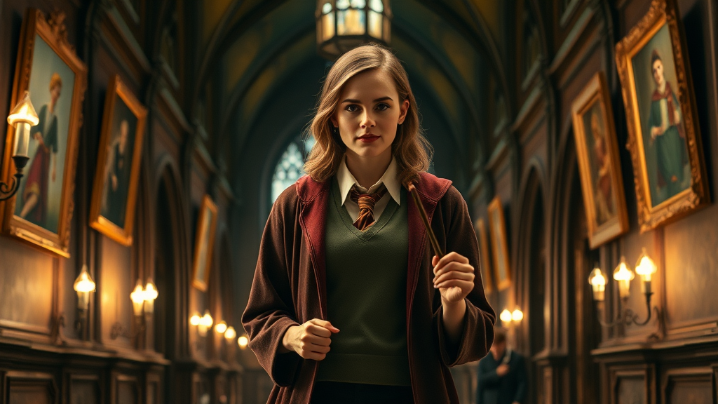 Within the majestic halls of Hogwarts, Emma Watson gracefully navigates the corridors, her presence enhanced by the timeless elegance of the Hogwarts school uniform. The flickering torches cast a warm glow on her as she strolls past animated portraits whispering secrets of the past. Her Gryffindor tie is tucked neatly under her vintage robes, and her wand is held with effortless confidence, ready to unleash magic at a moment's notice. Amidst the hustle and bustle of enchanted learning, her aura is a blend of wisdom and youthful curiosity, capturing the essence of a world where fantasy and reality intertwine.