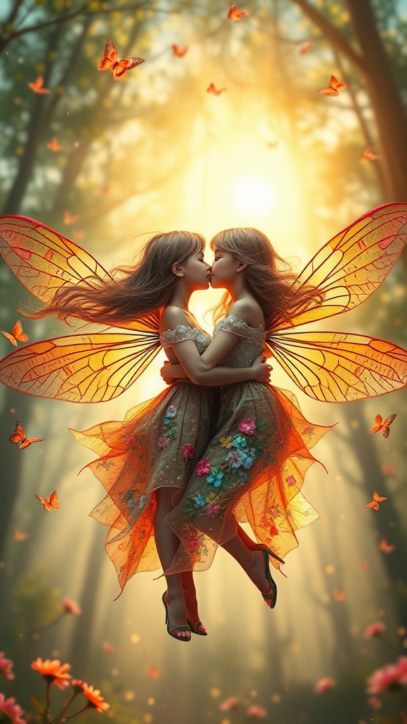 WLOP-inspired masterpiece, high-quality, hyper-detailed, colorful scene of two faerie girls flying and embracing joyfully in a luminous fantasy forest. They are kissing, with petite, youthful figures dressed in intricately designed off-shoulder floral faerie gowns. Their hair flows wildly with intricate details, highlighted by stray strands. They have symmetrical, vibrant dragonfly wings and are adorned with colorful, diamond heels. Their faces are beautifully detailed with glossy lips and expressive eyes, all captured through a Canon 5D 50 mm lens at f/1.2 aperture. The atmosphere is filled with joy and hope, with a whimsical and glamorous sky illuminated by glowing sunshine. Tiny, hyper-detailed butterflies float around them, enhancing the cinematic lighting and glowing colors. The setting exudes a cozy, fantastical, nostalgic mood with many intricate light reflections and rich, vibrant shading. Professional award-winning photography captures the scene in maximalist 8K resolution, offering ultra-detailed, expressive visuals with vibrant colors. The overall composition evokes a vintage show promotional poster aesthetic, emphasizing glamour and artistry with precision and masterful craft.