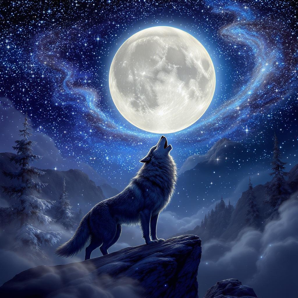 Wolf howling under an enchanting moonlit sky, intricate 8k detail reminiscent of Don Maitz and Todd McFarlane’s artistry, infused with the whimsical flair of Mary Blair. The scene is breathtaking, with every blink revealing new, mesmerizing nuances. Ethereal mist dances around the wolf, casting shadows that tell hidden stories. The moonlight shimmers like silver across a tapestry of stars, adding layers of magic and mystery.