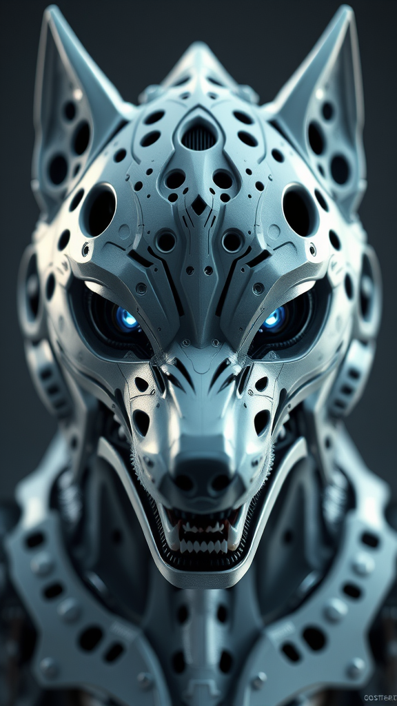 Wolf Nousr Robot, character design, detailed and intricately designed face, highly detailed, symmetrical yet with asymmetrical elements, digital 3D creation, hard-surface modeling, real-time rendering, VFX-enhanced, trending on ArtStation, ultra HD, HDR quality, featuring dynamic holes and a prominent mouth, elements going out of frame, intentionally distorted art style, slightly blurry with exaggerated proportions, unconventional proportions, unintended signature, abstract words, visible descriptions, and subtle watermarks.