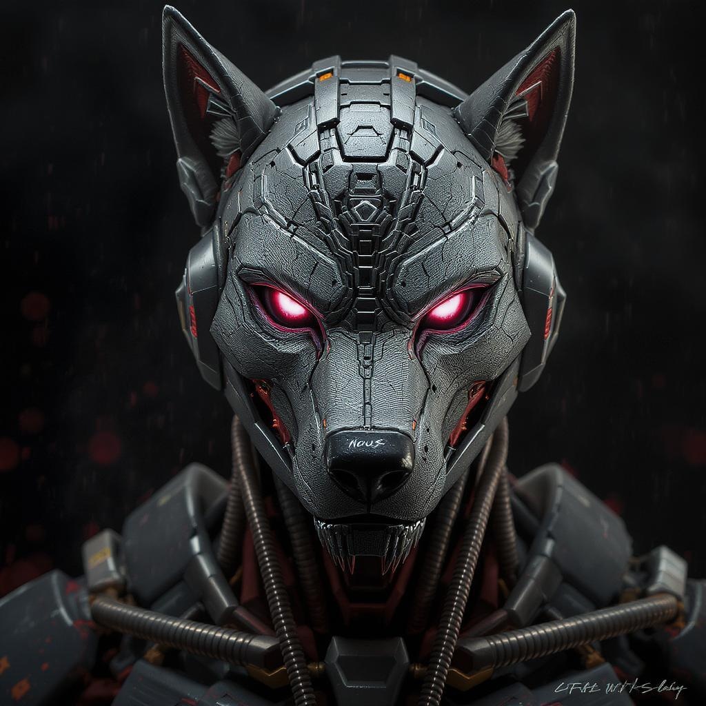 Wolf nousr robot character design detailed face highly detailed intricate details symmetrical digital 3d hard surface real time vfx trending on artstation ultra hd hdr asymmetrical apertures maw partially framed imperfect art soft focus distorted proportions unsettling dimensions artist signature text labels branding elements
