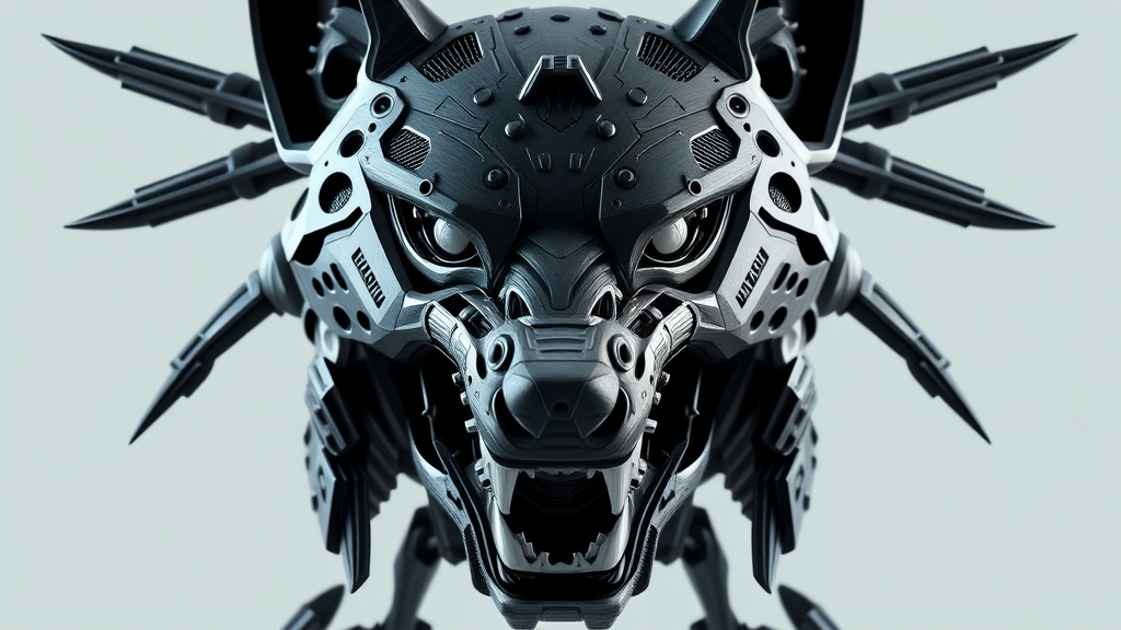 Wolf nousr robot, character design, highly intricate and detailed face, symmetrical yet uniquely asymmetrical elements, digital 3d rendering, hard surface finish, optimized for real-time VFX, trending style as seen on artstation, ultra hd clarity, hdr effects, features unique perforations and open mouth, dynamic composition with elements extending out of frame, purposefully exploring unconventional and abstract proportions, presence of artist's signature and subtle watermark details.