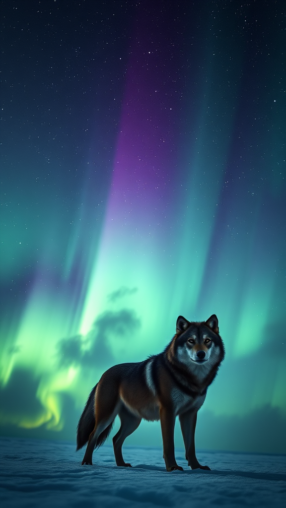 Wolf standing majestically beneath the vibrant aurora borealis, its silhouette sharply defined against the night sky, fur detailed and realistic, with clear and piercing eyes, four strong legs grounded on a snowy landscape. The sky is an expansive canvas of swirling greens and purples, dotted with thousands of twinkling stars. Captured in photorealism with a cinematic feel, as if shot on 65mm film using a long exposure, the composition is framed in an aspect ratio that emphasizes the vastness of the cosmos, enhancing the drama and serenity of this nocturnal moment.
