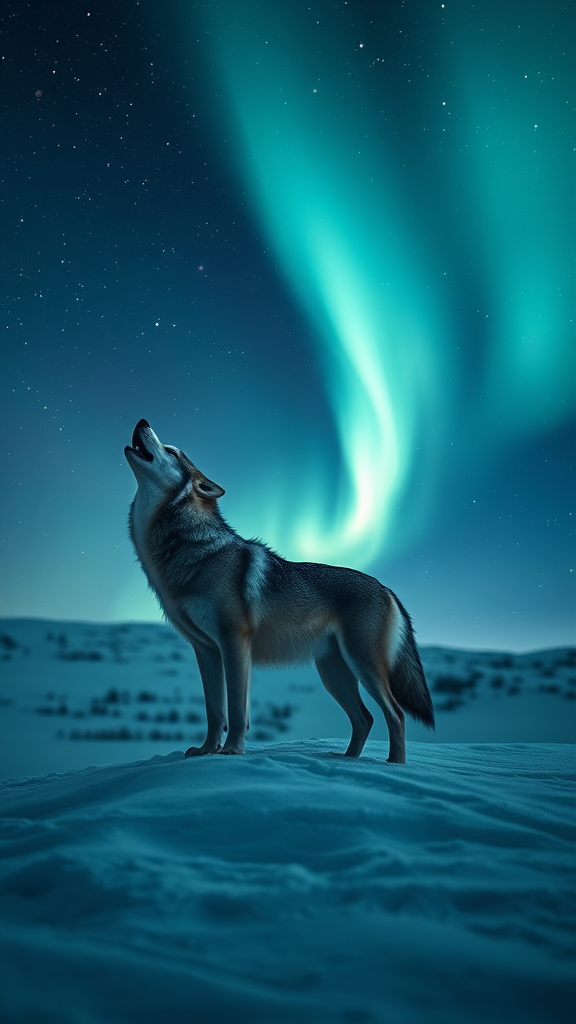 wolf standing on a snowy hill, howling beneath the shimmering aurora borealis, four strong legs, night scene, vast sky filled with twinkling stars, photorealism, ultra realistic, captured with a 70mm lens, extended exposure, vertical format, high definition detailing