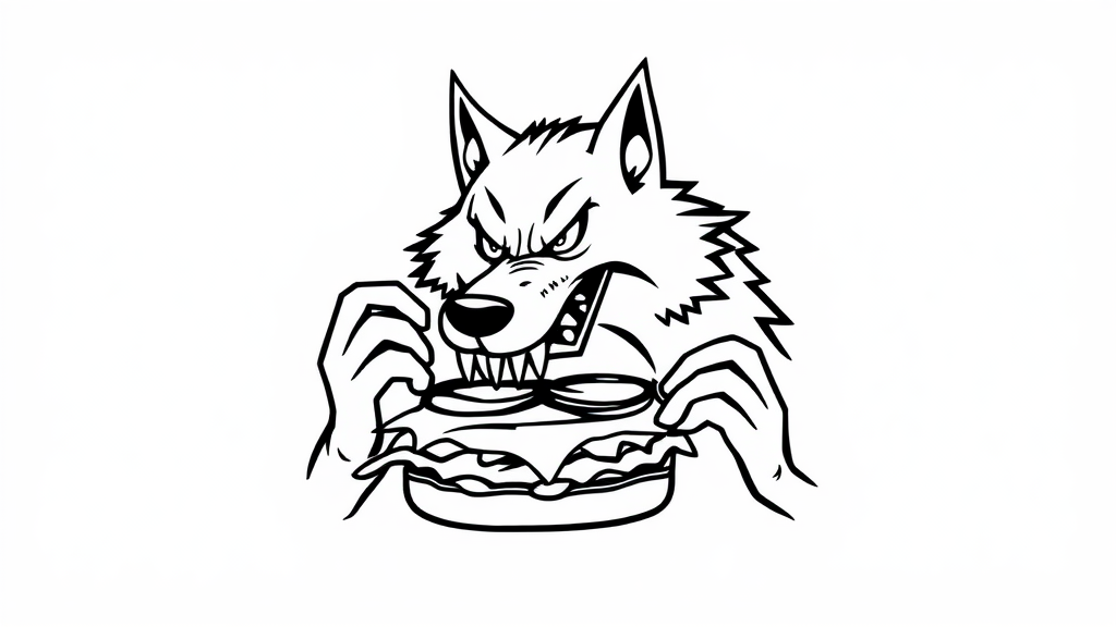 Wolfman enjoying a burger in a minimalist style, sleek black vector lines form the wolfman character on a stark white background, subtle creative details added to enhance the visual while maintaining simplicity.