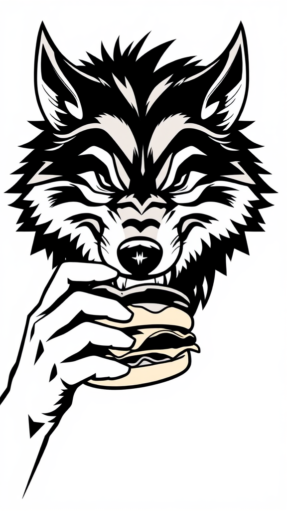Wolfman savoring a burger in a sleek, minimalistic design, black vector illustration on a white background, with an emphasis on clean lines and simplicity.