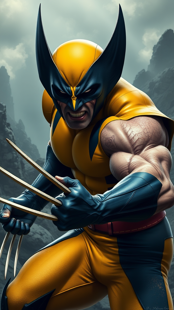 Wolverine in a classic yellow and blue suit character concept art by Roberto Ferri, intense pose, finely detailed, 4k resolution, ultra high definition, moody lighting with dynamic shadows, fierce expression, and subtly textured claws, wild rugged landscape backdrop, emphasizing raw power and agility.