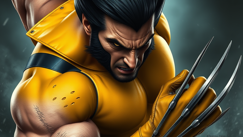 Wolverine in his iconic yellow suit character concept art by Roberto Ferri, showcasing a dynamic pose, rich texture details, 4k resolution, ultra-HD clarity, with intense and moody lighting. Wolverine exuding a raw, feral energy, claws unsheathed, amidst a stormy background that enhances the dramatic atmosphere. Intricate stitching visible in the fabric of his suit, sharpness in his eyes reflecting determination and resilience, with subtle scars hinting at battles past.