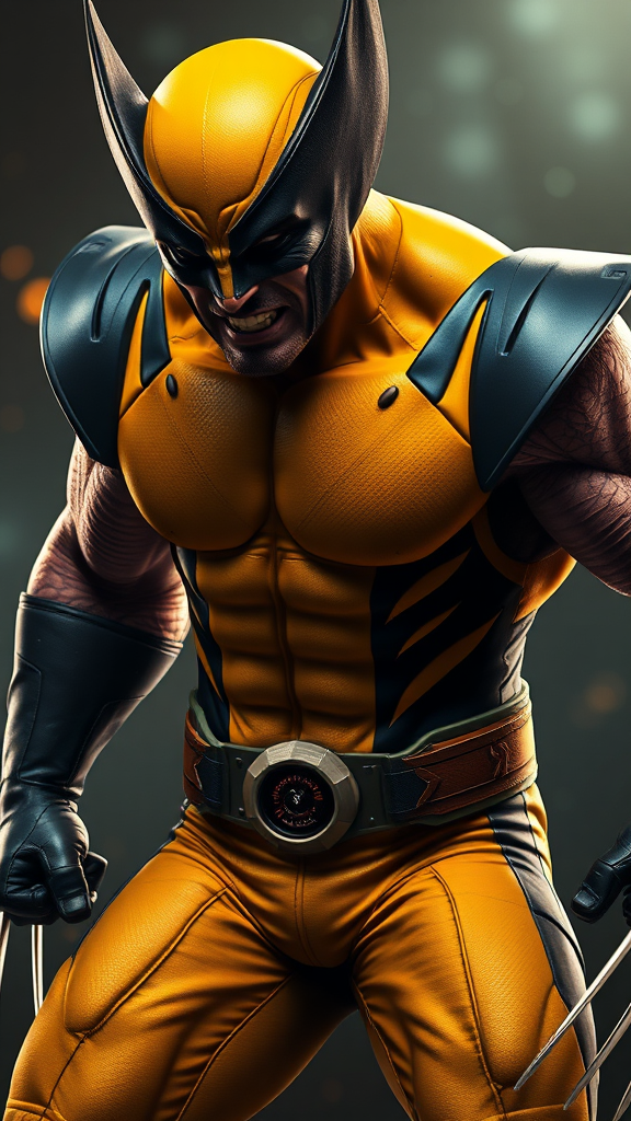 Wolverine in his iconic yellow suit, character concept art inspired by Roberto Ferri, showcasing a dynamic pose with intricate details and textures, rendered in stunning 4k UHD, featuring dramatic and moody lighting that highlights his fierce expression and muscular form, set against a visually captivating backdrop that enhances the epic nature of the shot.