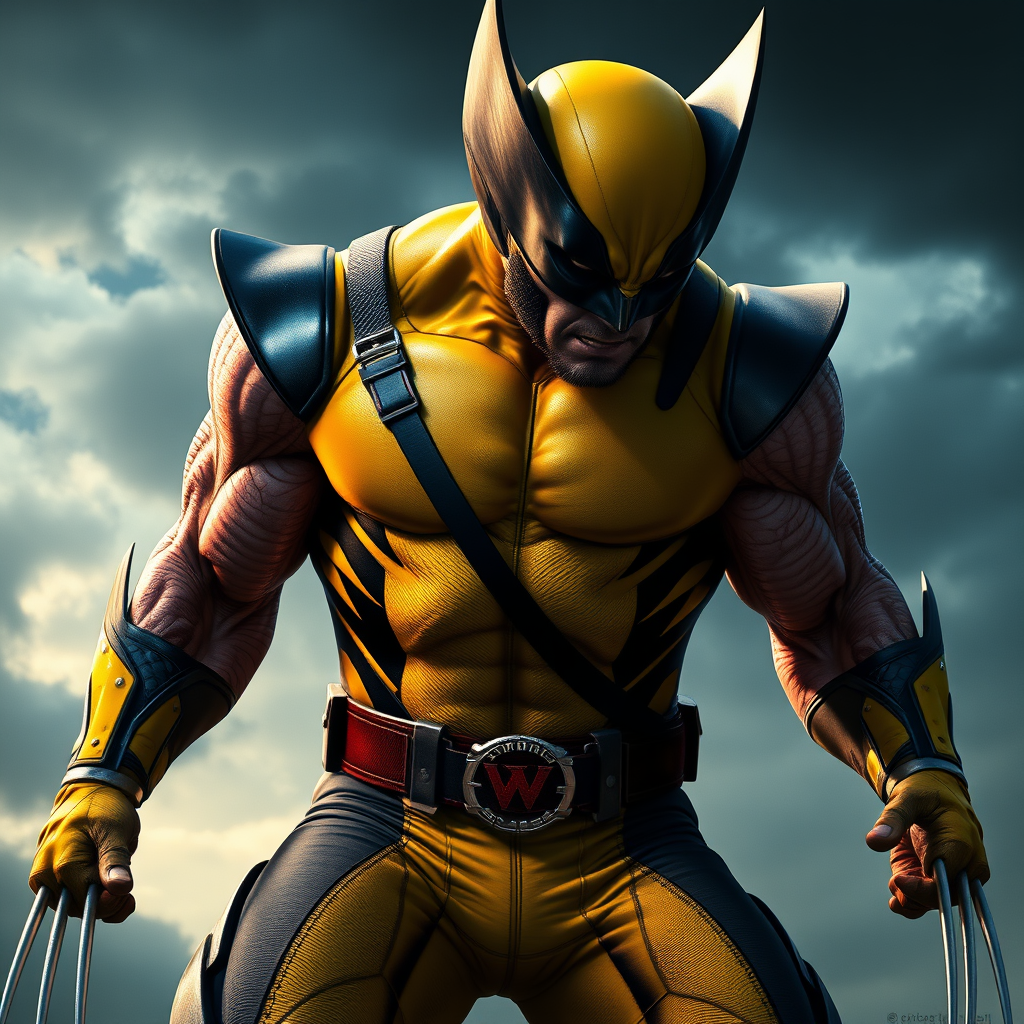 Wolverine in his iconic yellow suit concept art by Roberto Ferri, showcasing an epic pose with intricate costume details and dynamic muscle definition, captured in 4k ultra-high-definition with intense, dramatic lighting that casts striking shadows, adding a modern twist with subtle blue accents for contrast, all set against a stormy sky background to enhance the moody atmosphere.