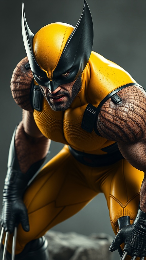 View this AI-generated image featuring wolverine in a modern reimagined yellow suit character concept art by roberto ferri powerful stance intricate textures 4k resolution ultra high definition dynamic lighting subtle metallic accents rugged yet refined intense expression rich shadows and highlights