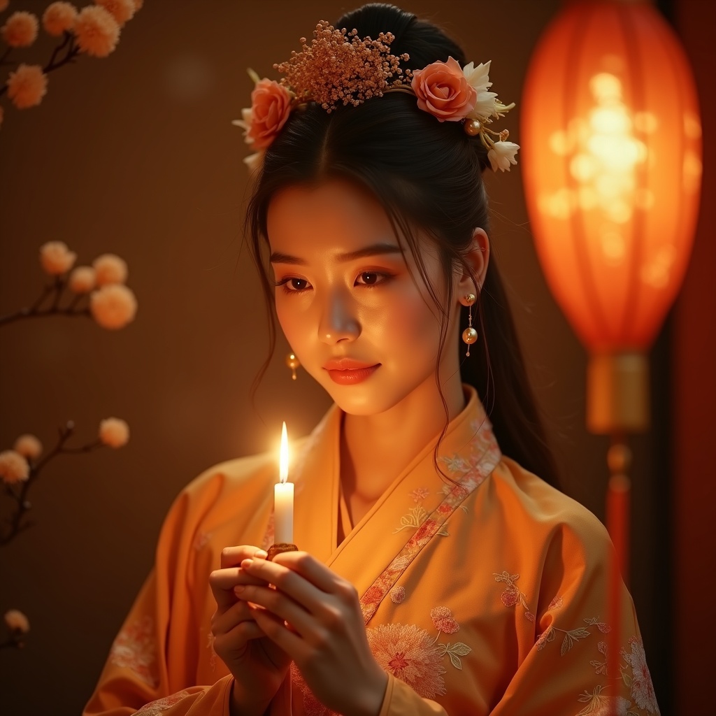 A Chinese woman adorned in oriental attire holding a flickering candle, set against a palette of deep orange and gold, captures a romantic interpretation of a historical scene. The atmosphere blends fairycore charm with the intimacy of webcam photography, as traditional techniques are reimagined in a tapestry of delicate flowers. The scene unfolds in a dreamlike quality, bridging past and present with a whimsical elegance.