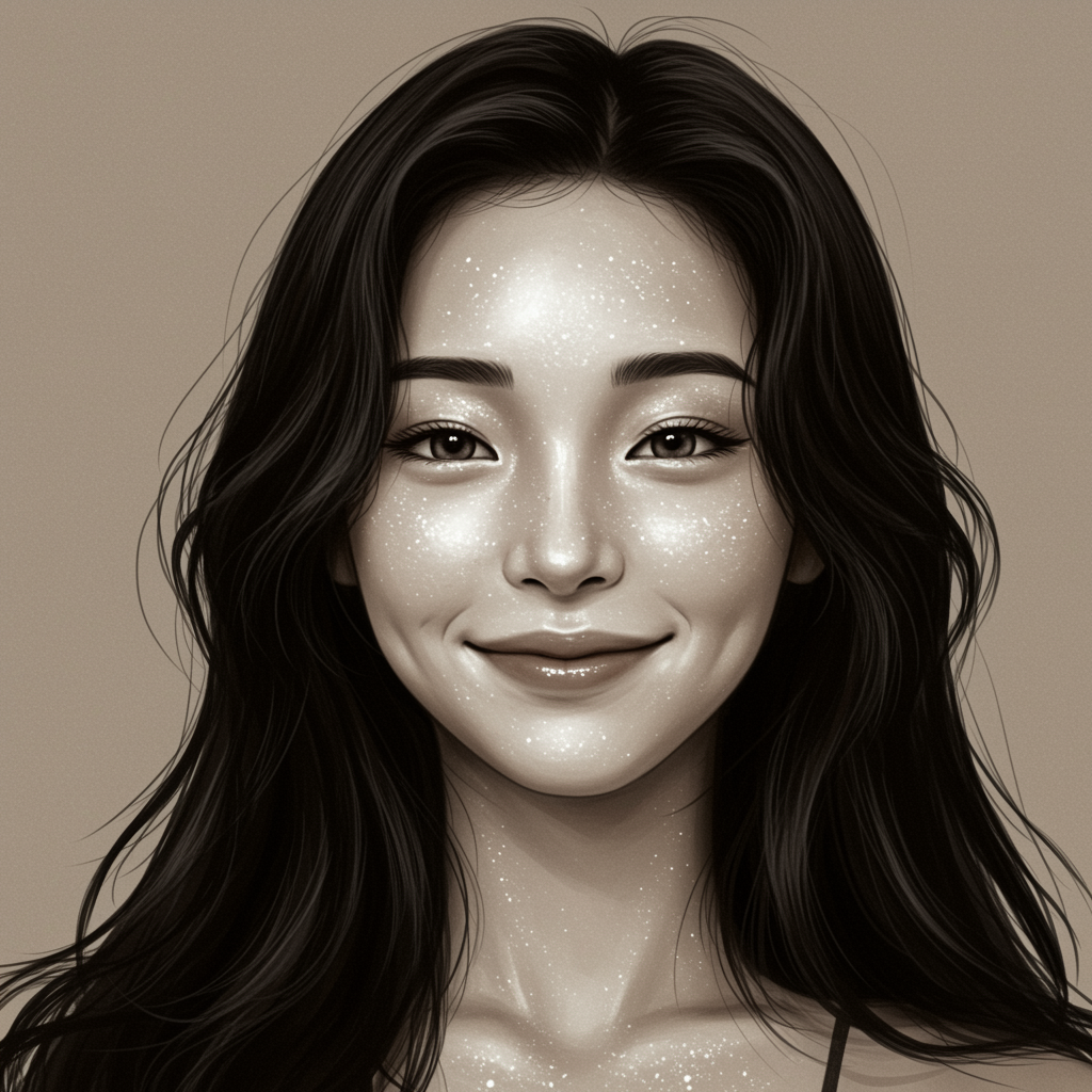 A single woman with flowing black hair and a beautifully detailed face, featuring luminous white skin with a humid sheen, smiling warmly. The illustration is 3D and rendered in sepia tones, akin to a painting combined with a cartoon and sketch style. Despite being low resolution, the image exudes normal quality with subtle imperfections like collapsed eyeshadow and extra eyebrows, infusing it with an analog, photo-like charm.