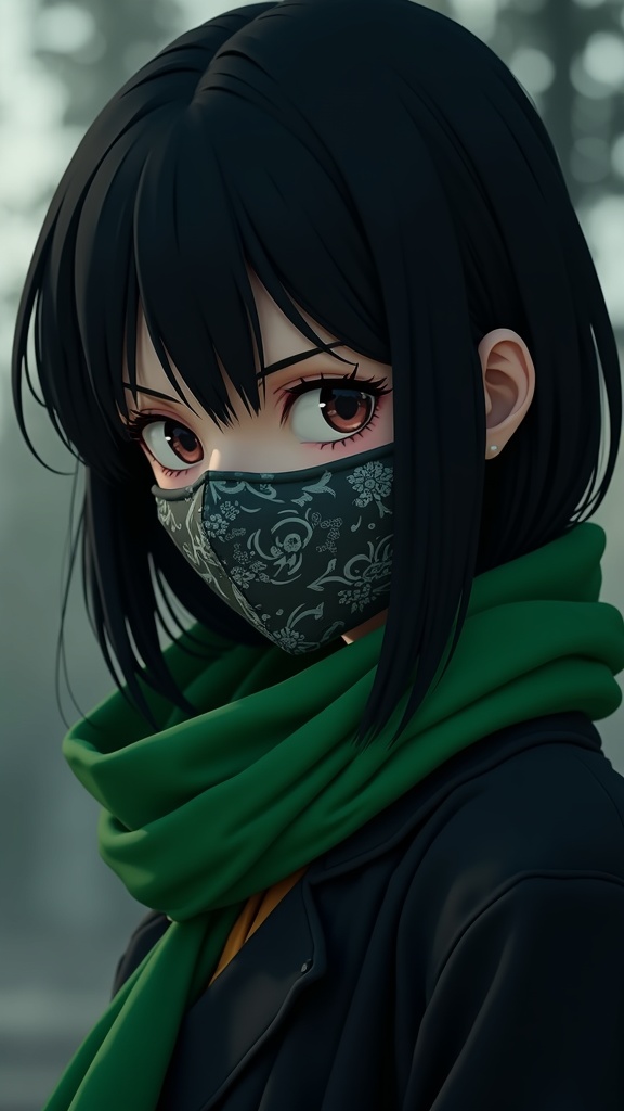 A focused woman with sleek black hair, wearing a dark jacket and a vibrant green scarf. Her expression is intense, and she dons a patterned cloth face mask. The scene is crafted in a 3D anime style, rendered in ultra-high definition, creating a strikingly realistic and expressive appearance, utilizing advanced rendering techniques inspired by a cinematic engine to capture every subtle detail and expression.
