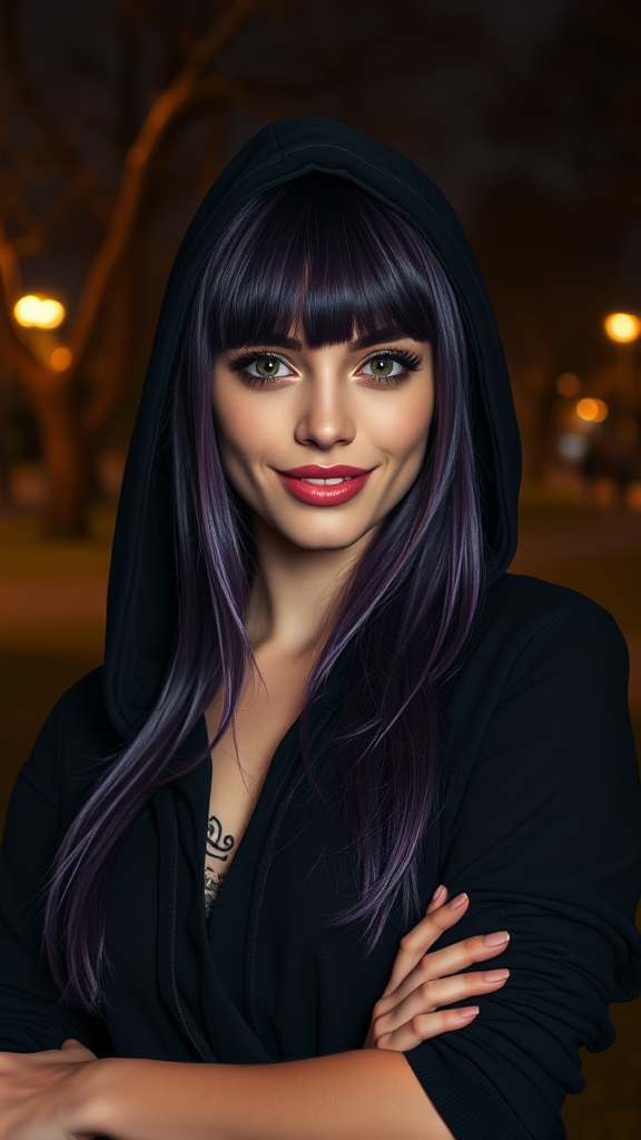 Woman, black hoodie, arm tattoo, long purple hair, bangs, small breasts, big green eyes, detailed park background, night setting, portrait, smiling with a seductive look, dim lights, 8k UHD resolution, realistic style, focused face, Nikon Z9, ray tracing effects, long neck, clear and sharp image, no text or artifacts, multiple views, warm and inviting atmosphere.