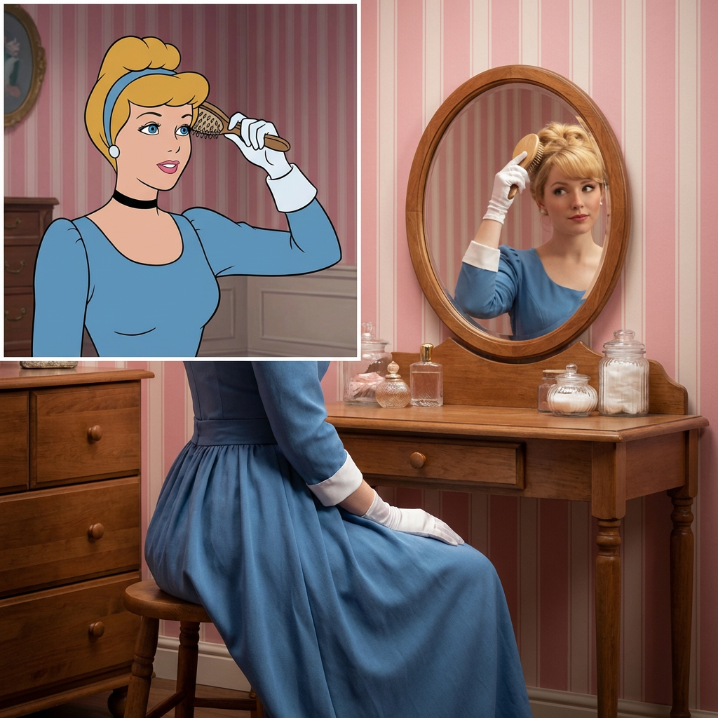 A woman in a blue dress and white gloves brushes her hair while looking into an oval mirror on a wooden vanity table. The scene captures a classic, elegant moment of self-care in a charming, striped room.