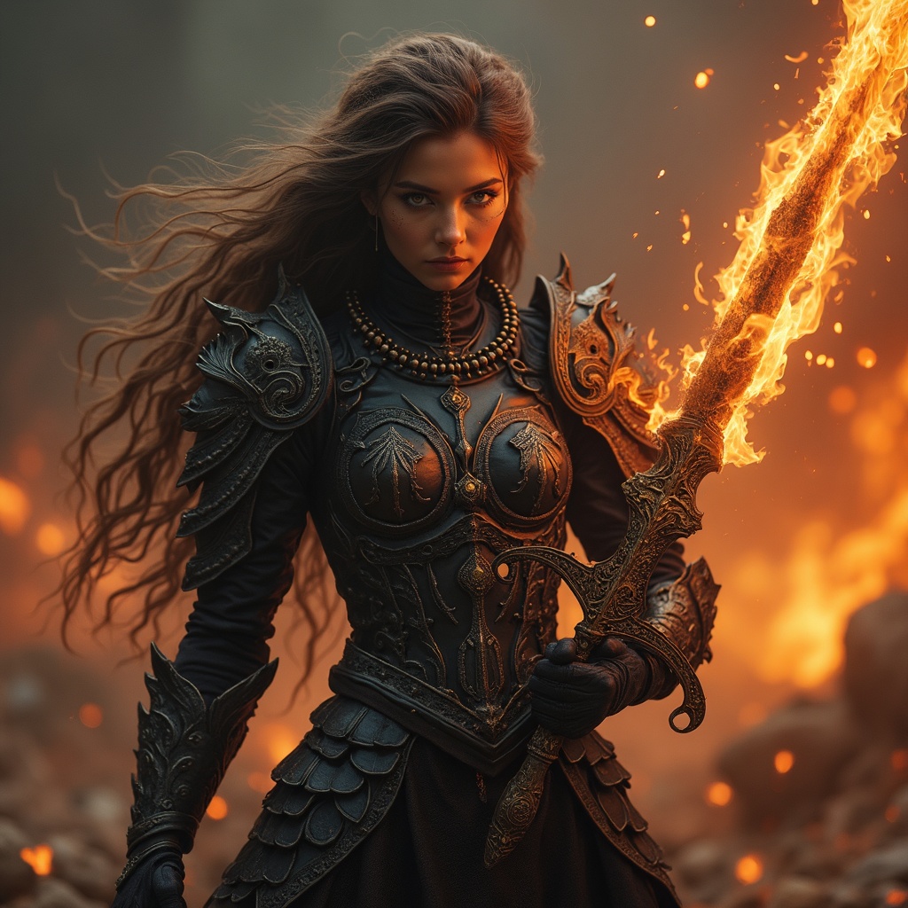 View this AI-generated image featuring a realistic woman clad in intimidating black armor with intricate dragon motifs she wields a blazing fire sword her human face is captivating framed by long flowing hair with each facial feature rendered in astonishing detail the armor reminiscent of mythical d