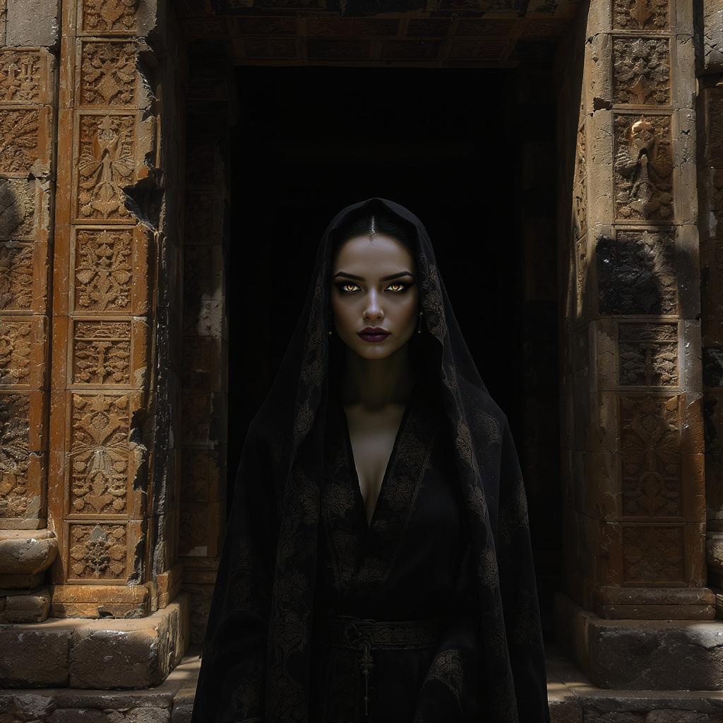 View this AI-generated image featuring a solitary woman cloaked in dark intricate robes stands at the entrance of an ancient temple her eyes perfectly symmetrical reflect the dramatic lighting that casts sharp shadows across her face the scene is rendered with hyperrealistic detail capturing every d
