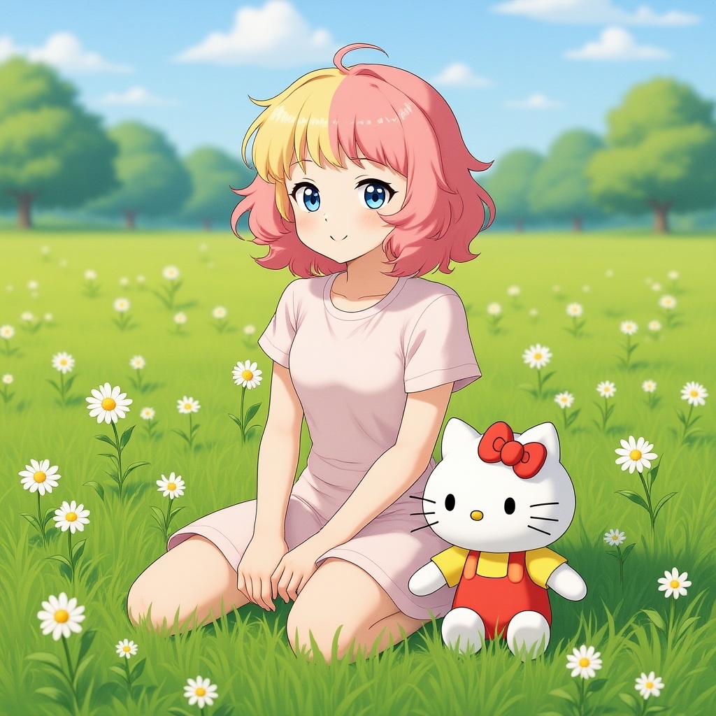 A young woman with short, curly pink and blonde hair is leisurely seated in a meadow, exuding a serene and relaxed aura. The scene captures the essence of Studio Ghibli's enchanting detail, as delicate wildflowers sway gently around her. Within this peaceful setting, a cute Hello Kitty plush sits beside her, adding a whimsical charm to the picturesque landscape. The atmosphere conveys a sense of tranquility and detailed artistry, reminiscent of cinematic storytelling, inviting viewers to immerse themselves in this idyllic moment.