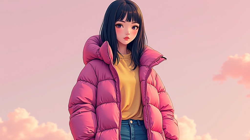 A fashionable woman dons a poncho-style oversized puffer jacket, channeling Off-White aesthetics, with a vibrant digital art style imbued with the essence of Yanjun Cheng. This piece merges the whimsical spirit of the lofi girl internet meme with Tumblr-esque vibes, capturing the attention of onlookers like a hot topic on Dezeen. Crafted as a striking catalog photo, the illustration embodies the 3D render finesse found in Beeple's work, infused with artistic nuances from Rhads and Lois van Baarle. Set against a backdrop of bright pastel colors, the image presents a retro anime girl, merging cartoon charm with modern flair, creating a beautiful and captivating artwork.