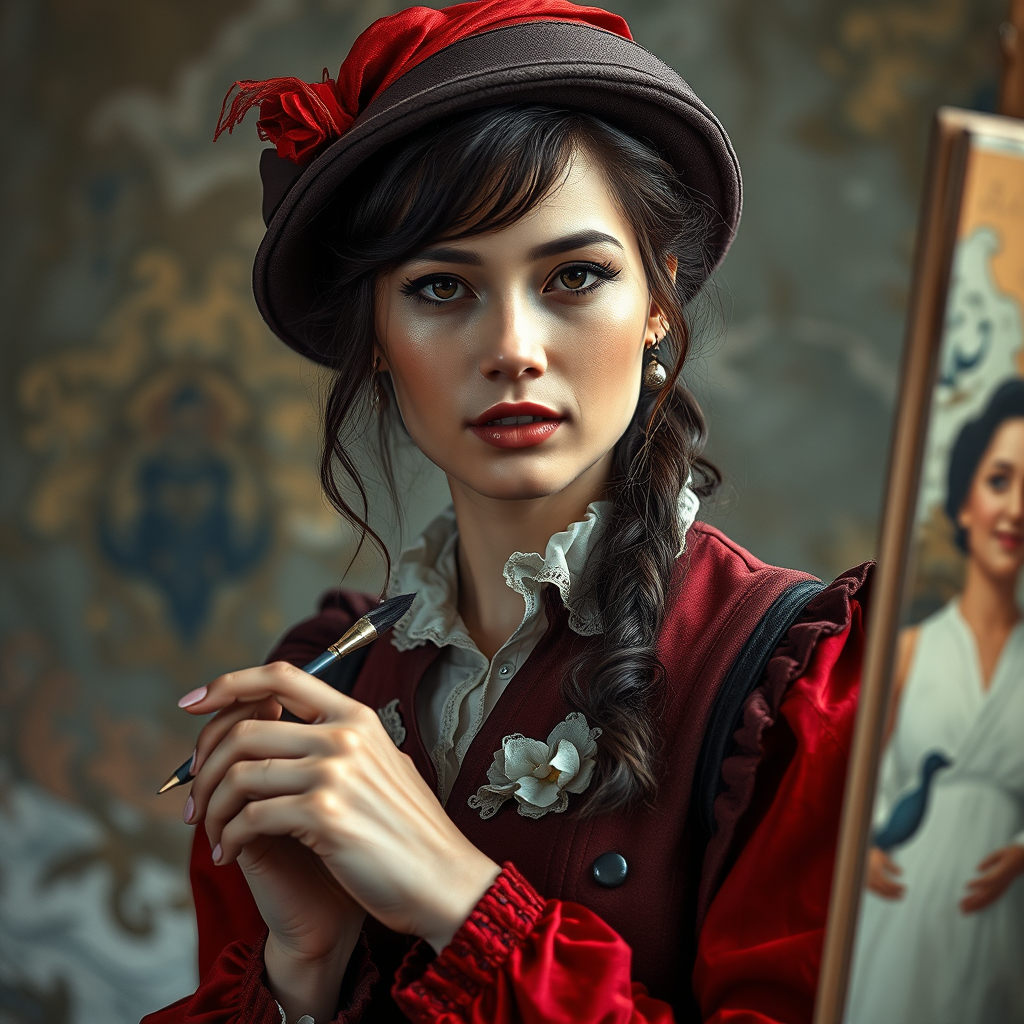 Woman dressed as a French artist painting on canvas, showcasing a painter’s demeanor, with an emphasis on photography. The image captures a detailed and realistic portrayal, offering an 8k photo-realistic view with highly detailed textures and full-length framing. The scene is enhanced with high detail in RAW color art, depicting her with a piercing and soft diffused lighting that complements the shallow depth of field. The focus is sharp and emphasizes hyperrealism, employing cinematic CGI lighting for a 3D effect. The image is free from low resolution, text, and any imperfections such as cropped edges, jpeg artifacts, or visual deformities. All elements are proportionate, maintaining lifelike anatomy, with accurate and delicately drawn hands and face. Avoidance of any post-processing effects like watermarks, signatures, or user marks ensures a clean, professional rendition.