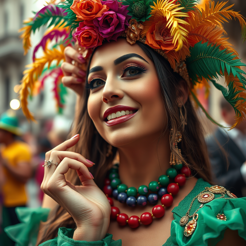 Woman enjoying Mardi Gras in vibrant, expressive colors, captivating and flirtatious, engaging with the viewer, portrait style, photographed with lifelike, detailed skin, capturing a realistic, photo-realistic image in ultra-high-definition, full-length composition. Rendered with high detail, maintaining RAW color artistry, featuring subtle piercing and enveloped in diffused soft lighting. Employ shallow depth of field, ensuring sharp focus, embodying hyperrealism with cinematic lighting. Avoid elements such as text, signatures, or any distortions like inaccurate anatomy or altered limbs to maintain a pristine, visually appealing image.