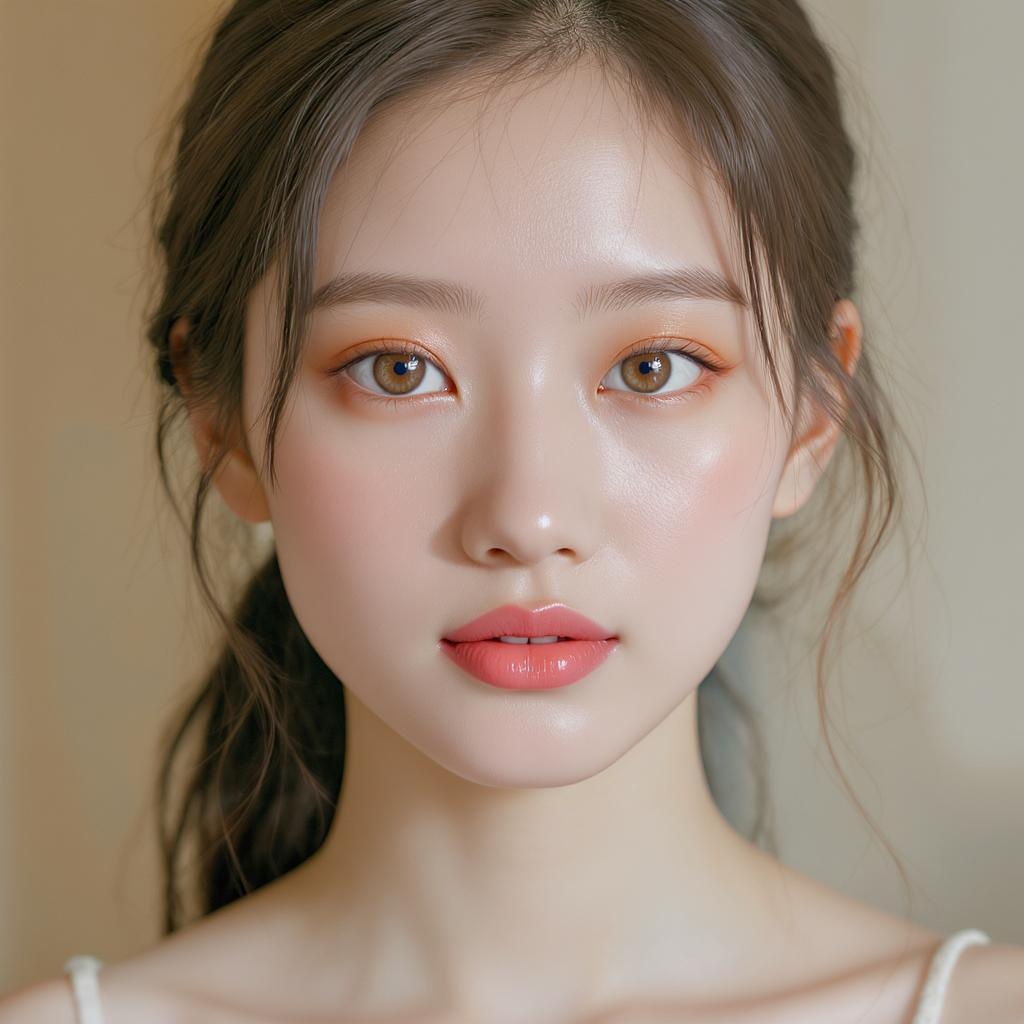 A young woman, exquisitely detailed and lifelike, her distinctive nose the centerpiece of her serene visage, light pink and amber tones gently suffusing her skin. Rendered with the precision of Maya and the rich depth of Velvia film, her calm and serene beauty emanates a quiet elegance. The line work is flawless, capturing the essence of her youthful grace, maintaining the core concept while allowing for small creative touches, bringing a unique freshness to the composition.