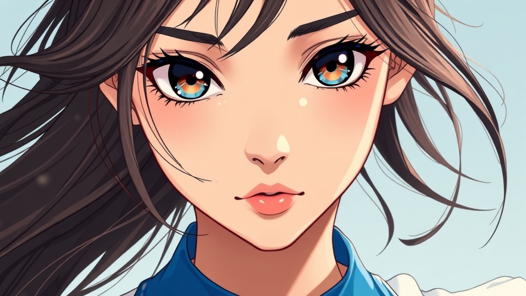 A close-up of a young woman with striking features in a white dress featuring a vibrant blue collar, reminiscent of the Knights of the Zodiac. Her expression embodies a retro anime girl charm, merging the classic 1980s anime art style with contemporary influences. The art evokes a blend of Ilya Kuvshinov's smooth and expressive style and Artgerm's dynamic touch. Her eyes are large and reflective, with a sense of mystery and determination, framed by flowing hair that catches the light. The digital illustration captures vivid detail and high-resolution quality, encapsulating an 8k aesthetic that celebrates both nostalgia and modernity in anime artistry.