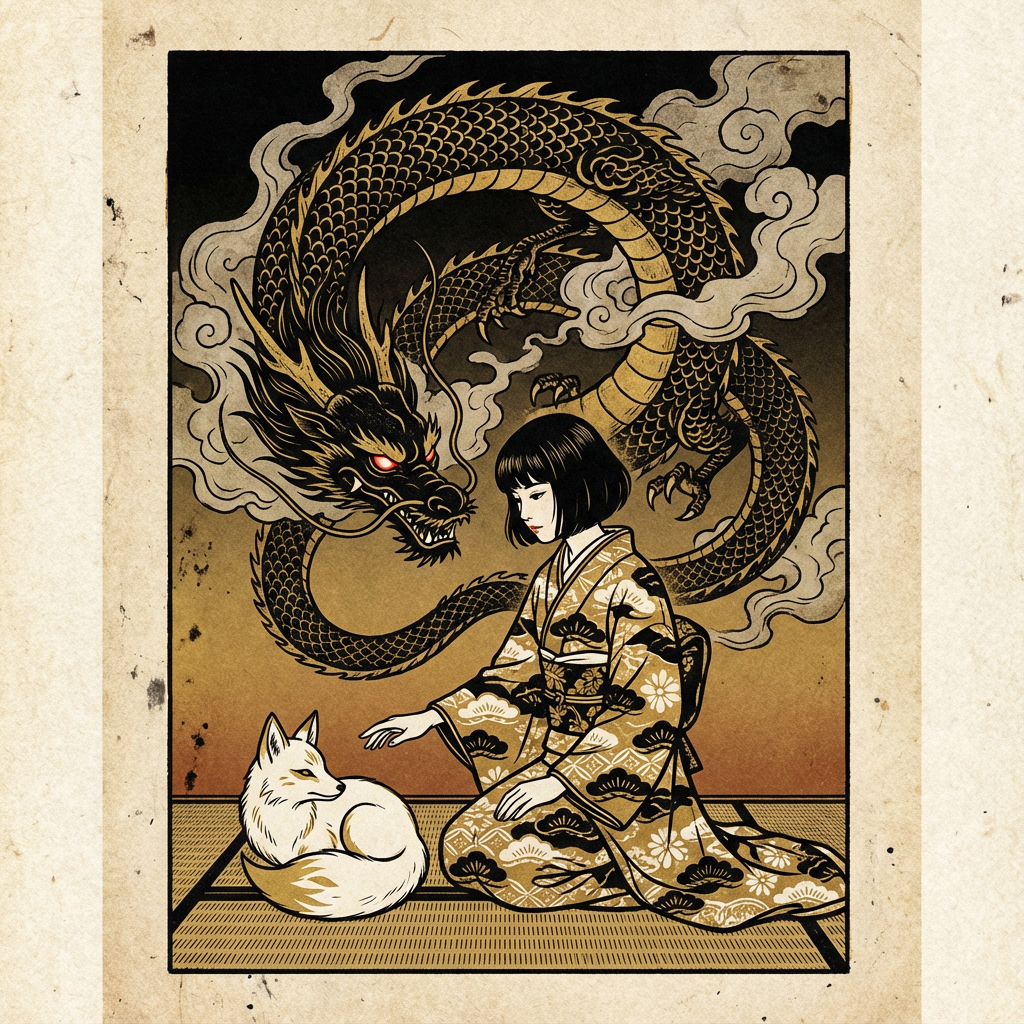 A serene woman in a patterned kimono kneels beside a white fox, while a formidable golden dragon with glowing red eyes looms behind them. The dramatic lighting and traditional Japanese art style create a mysterious and elegant atmosphere.