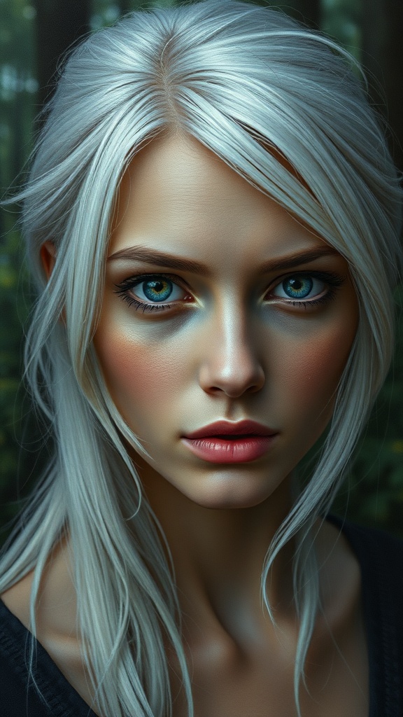 A stunning woman with white hair gazes at the camera, her expression melancholic with a single tear. The oil painting, done in hyper-realistic style, captures her face with exquisite detail, set against the backdrop of a lush forest. The high-resolution image exudes an 8K quality, showing textured skin and remarkable detail in her pupils. Shot with a cinematic camera, the portrait maintains a studio-like sharpness with no distortions or imperfections. The composition is flawless, focusing solely on her perfect face, without any distractions or anomalies. Her gaze tells a silent story, inviting viewers into her world.