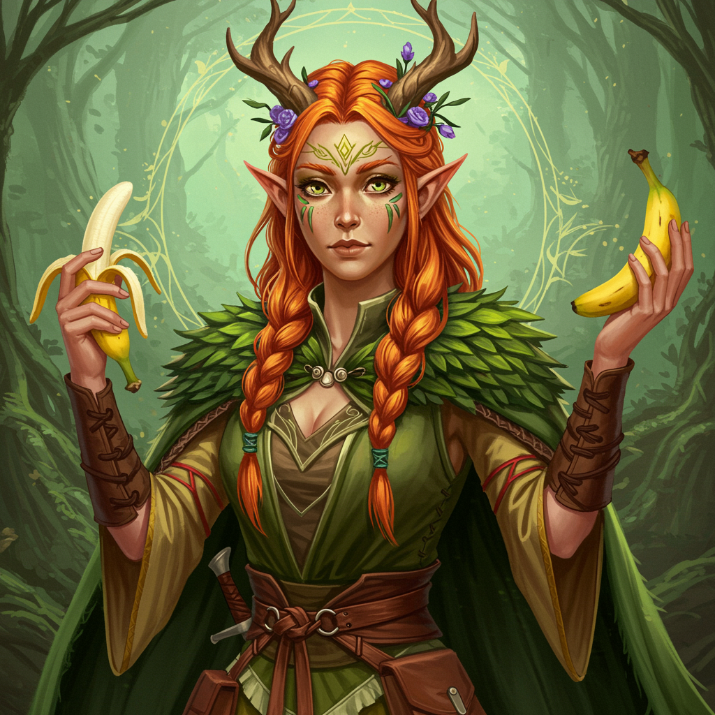 View this AI-generated image featuring a mystical woman with a banana in her hand embodying the dual essence of a sorceress and a half elf her presence exudes the ancient wisdom of a forest mage her visage conveys the grace of a druid captured in a detailed matte fantasy style reminiscent of magali