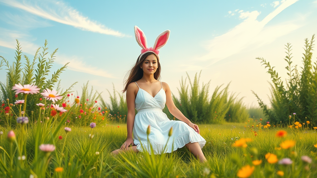Woman in a flowing white sundress, sitting barefoot in a lush meadow, surrounded by vibrant flowers and towering greenery, wearing a pair of bright pink bunny ears shaped like oversized daisies, against a warm and soft blue sky with a few wispy white clouds, as depicted by a young and struggling artist with a few striking but rough flourishes.