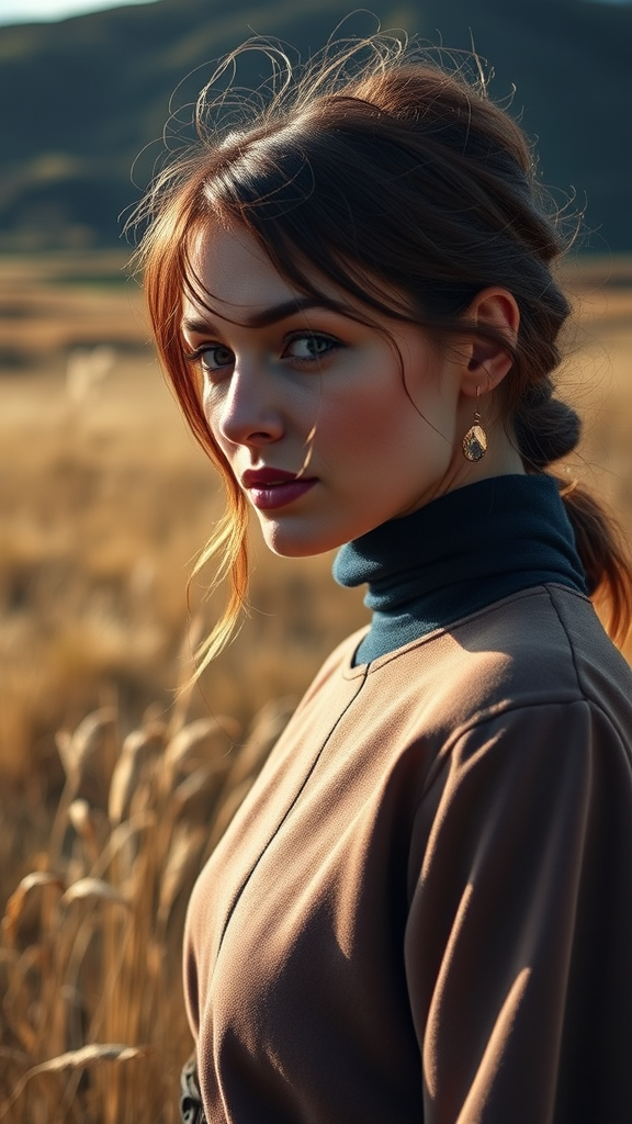 Woman in a rustic field, styled like an outdoor fashion shoot, bathed in natural lighting against the backdrop of Scottish landscapes, dressed in light navy and deep brown tones, exuding the elegance of Georg Jensen, with intense close-ups capturing her essence, photographed using a Sony A7III, with an aspect ratio of 34:65.