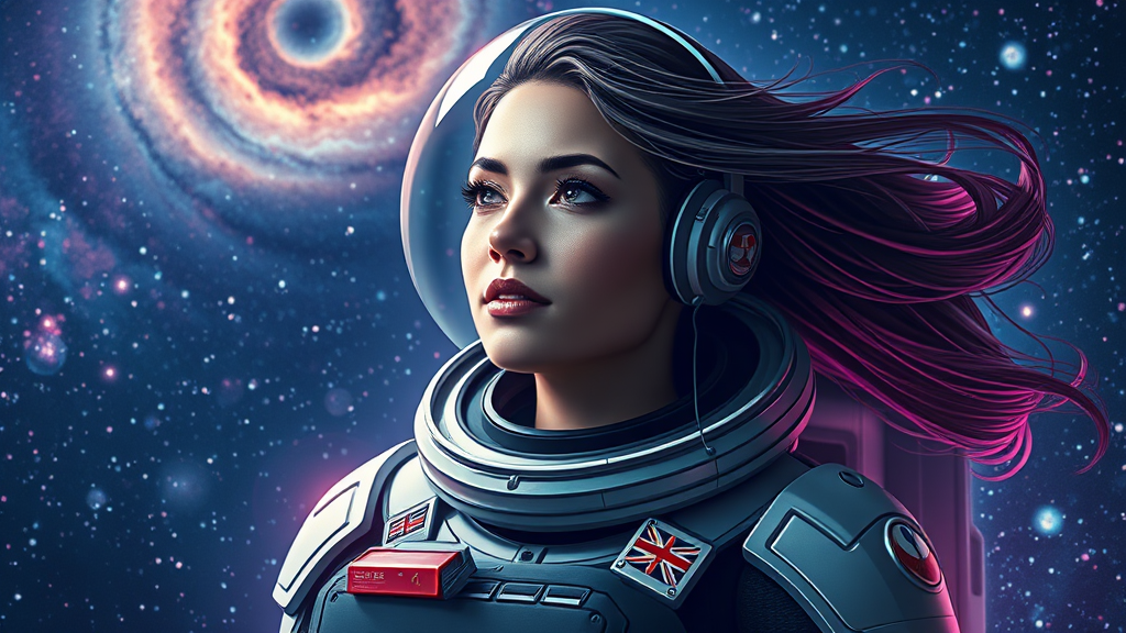 Woman in a space suit character portrait space art retro-futuristic armor high detailed official artwork her hair is the swirling Milky Way galaxy fantastic screenshot art hyperrealism dynamic lighting vibrant colors 3D touches anime influences sketch-inspired lining cinematic composition ethereal glow atmospheric setting elegant blend of realism and fantasy futuristic background full of stars and nebulae.